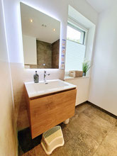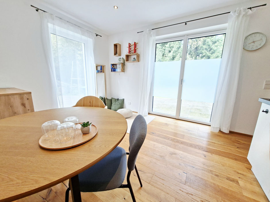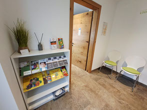 Der Wartebereich ist 6,38m² groß und bietet Sitzmöglichkeiten für Groß und Klein. Im Sommer und bei schönem Wetter steht auch eine Wartemöglichkeit auf der Terasse vor der Praxis, mit Blick auf den Wilden Kaiser, zur Verfügung.
