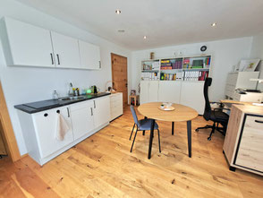 Der Therapieraum ist 21,17m² groß, hell und voll ausgestattet für Einzel- oder Gruppentherapien. Er verfügt über abschließbaren Stauraum, sowie einen mit Internet und Drucker ausgestatteten Arbeitsplatz. Eine Matte zur Arbeit am Boden, eine mobile Liege, sowie ein runder Therapietisch stehen ebenfalls zur Verfügung. Weiters gibt es einen Küchenblock mit Kühl-/Gefrierkombi, Herdplatte, Waschbecken und Kaffeemaschine.